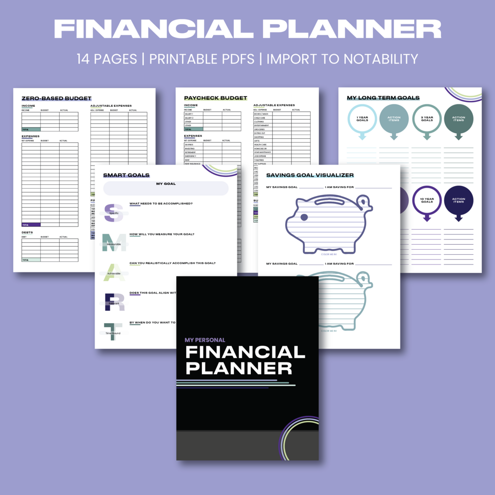 •14 Pages • Zero Based Budget • Paycheck Budget • Long Term Goal Sheet • SMART Goal Sheet • Savings Visualizer • Monthly Income Sheet • Monthly Bills Sheet • Monthly Expenses Sheet • Savings Sheet • 2 Savings Challenges